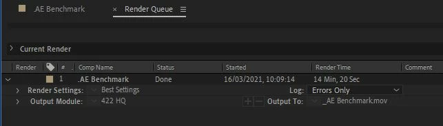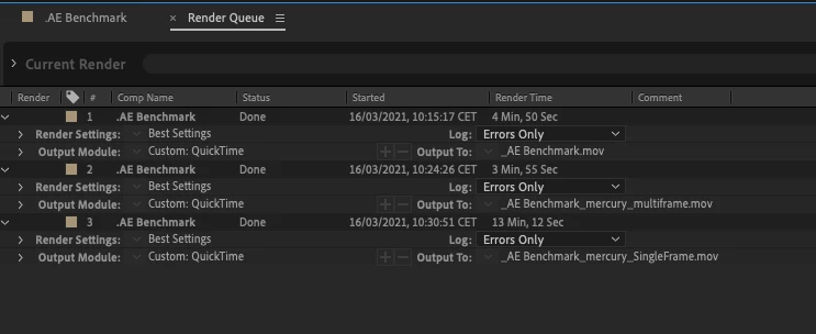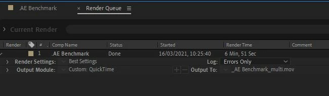 • Use Ae Render Queue to export the benchmark project in Multi-Frame mode.