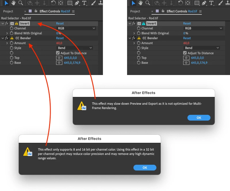 Maybe this will be obsolete once all effects are ported to Multi Frame Rendering but as there are also a lot of 3rd party effects that will take some time to be adjusted it might be helpful to get a different warning icon in the Effects Panel if the effect does not support MFR. This would help to identify possible MFR slowdowns immediately. At the moment it is the same icon like when getting a warning about bit depth. A different color would already do …