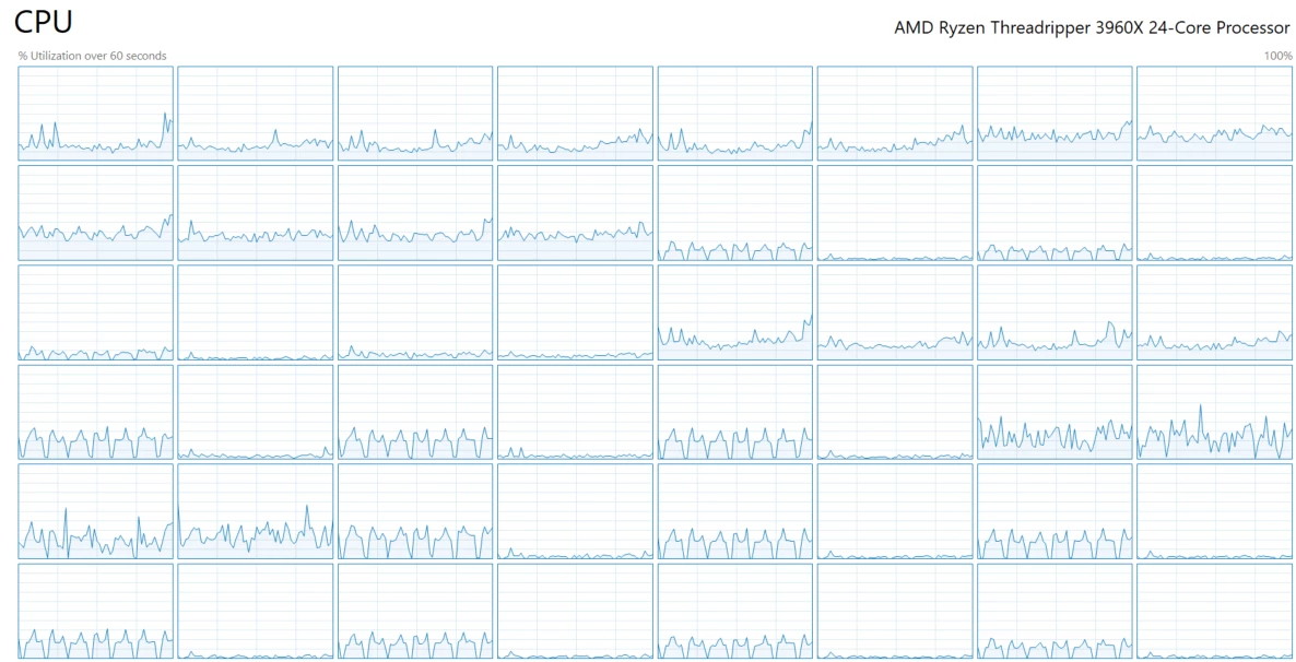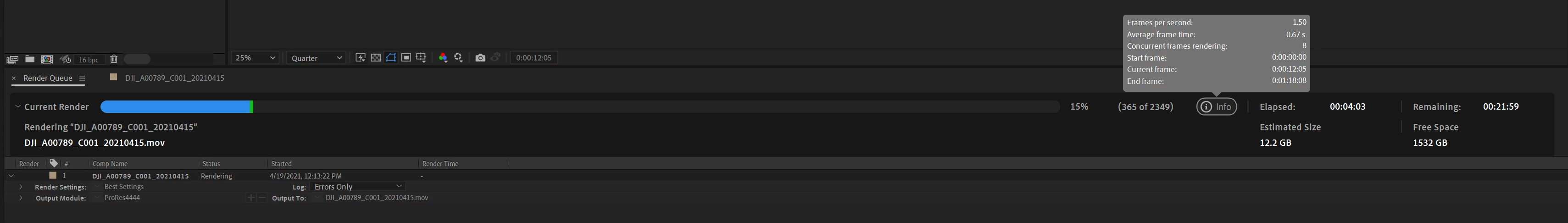 I have some Inspire 2 DNG raw footage to process and I wanted to see how the multi-frame render handled that as its typically very very slow to render out these clips through AE but gives you the best quality. Its able to render 8 frame simultaneously which is probably a decent speedup but the CPU is looking a bit underutilized. I also had to turn off Mercury because with that only the concurent frames number was only 2.