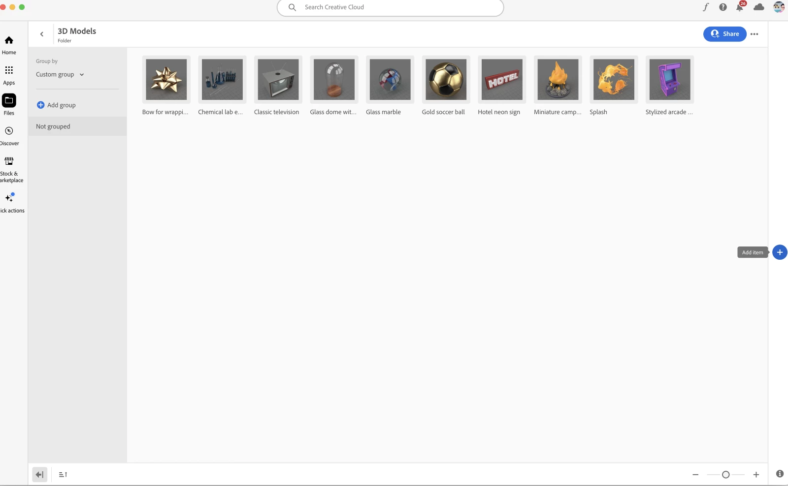 While you can also upload your own .obj models to your CC Libraries via the Creative Cloud Desktop App, these files will only come in with the model itself and no materials.
