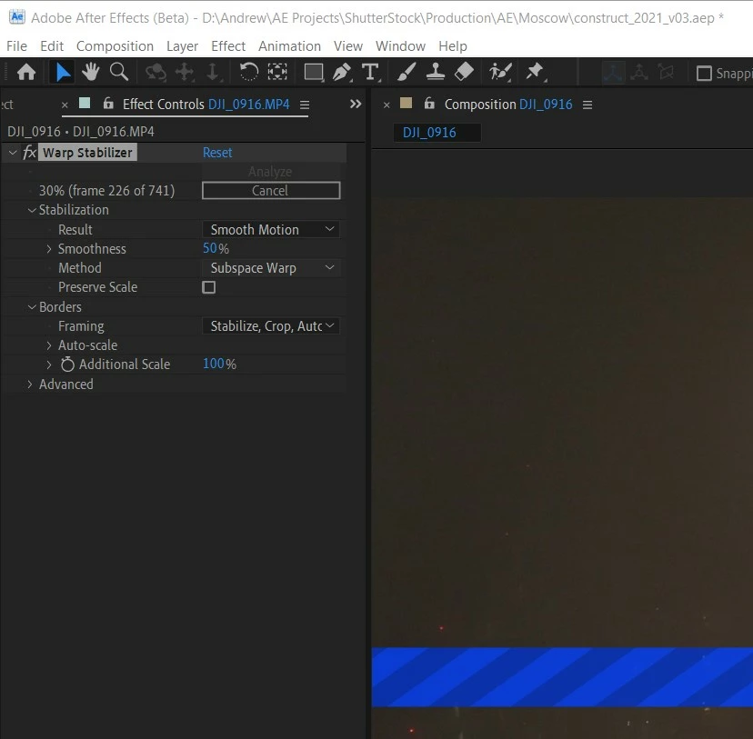 Hello! New warp stabilizer freeezes, when analyzing, % and time are not changing, and if I press cancel After Effects becomes "not responding".