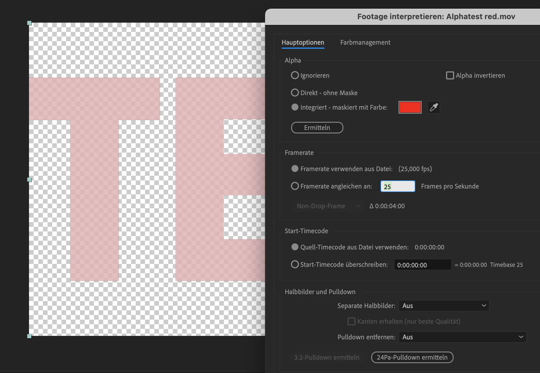 tanzblumeKnown ParticipantForum|Forum|4 years agoMarch 1, 2021QuestionPremultiplied Alpha will not interpretedForum|Forum|4 years agoMarch 1, 20210 replies251 viewsI rendered a premultiplied clip with red background.After an import to After Effects and interpretation as background color red there is no effect to show it correctly.Since CC 2019 the interpretation of the background color has no effect.FeedbackBugError