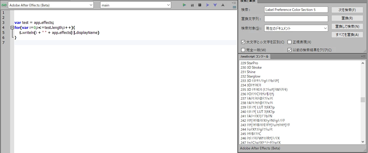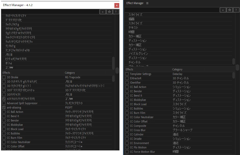 The displayName of the effect and aerender that can be obtained by the script is garbled in Japanese