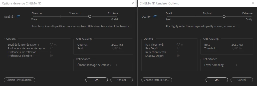 Dans les options de rendu CINEMA 4D avec une qualité à 67 :