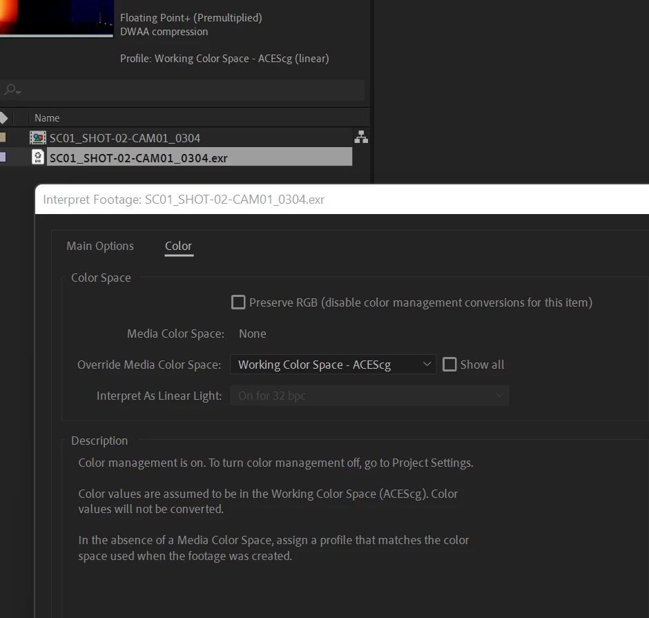 b. Media Color Space can be overridden via the Interpret Footage dialog accessed by right-clicking the footage in your Project panel