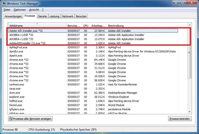 I have trouble with my PC to install any kind of adobe air app. When I start to install a Adobe air app, I get the UAC request and I confirm it but then the Adobe Air Application Installer.exe *32 is hanging and doing nothing.