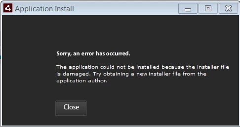 "Application Install >>> Sorry, an error has occurred: The application could not be installed because the installer file is damaged. Try obtaining a new installer file from the application author."