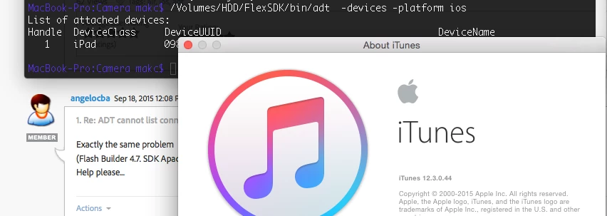 After updating to iTunes 12.3 today I can no longer list connected devices and can't deploy to them.