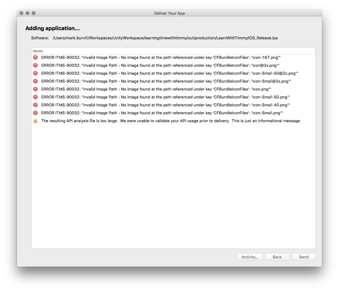 I'm trying to submit an updated version of an iOS app to Apple using Application Loader, and it's complaining about icons missing (see screenshot). Previous versions of the app have been submitted many times before without this issue, and we've made no changes to the icons or to the part of the app descriptor that lists them.