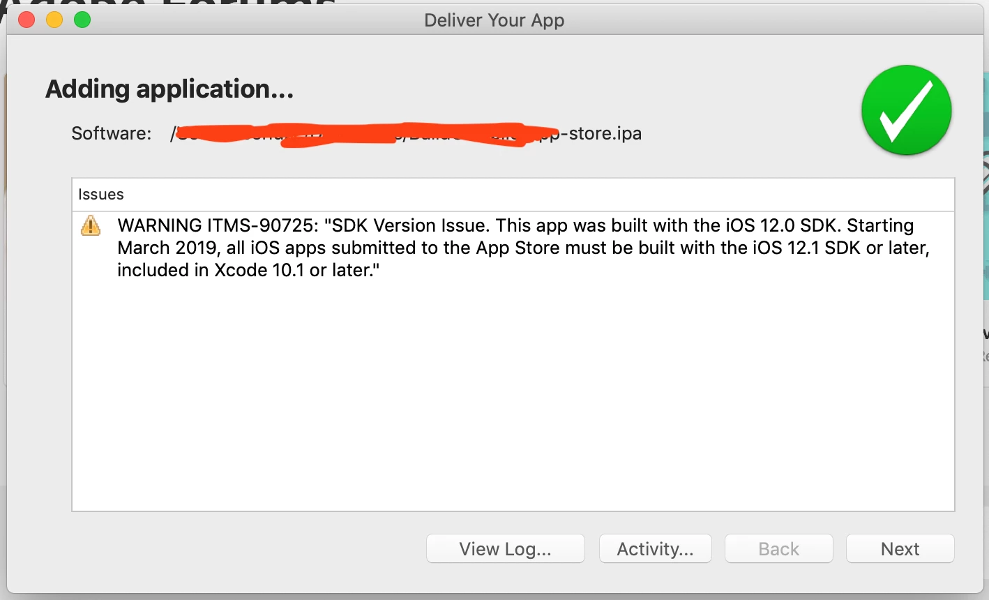 WARNING ITMS-90725: "SDK Version Issue. This app was built with the iOS 12.0 SDK. Starting March 2019, all iOS apps submitted to the App Store must be built with the iOS 12.1 SDK or later, included in Xcode 10.1 or later."