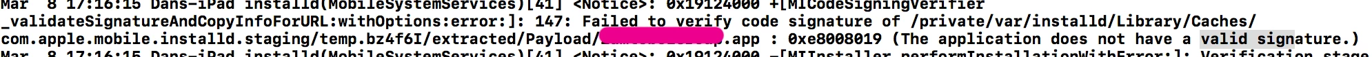 However: when uploading the same IPA to a remote location, the application will download but fails to install completely, giving me the "[appname] could not be installed" message. This occurs on my test devices, but also on the corporate devices which have the required certificate installed. This happens when I upload the build to HockeyApp, and also the client's corporate distribution system (I'm unsure what system this is, but the end result is the same when users download the app)