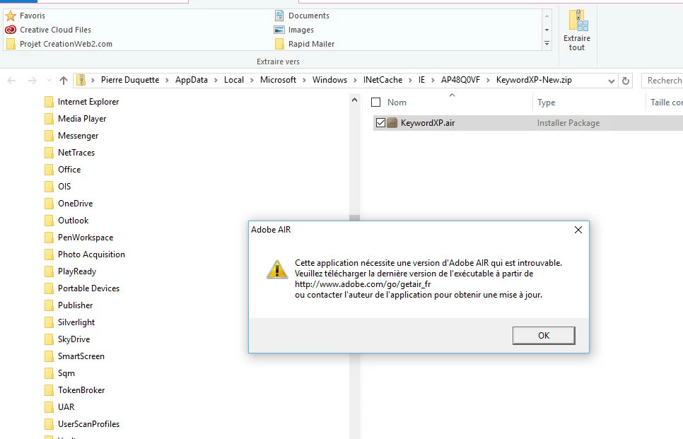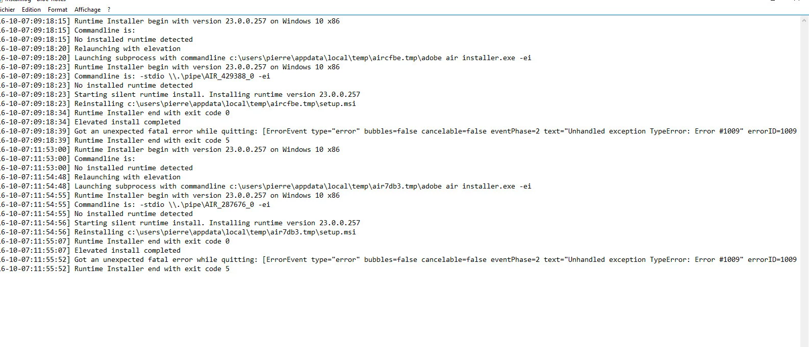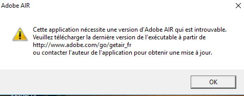 old applications that are using air and I get the message that a version or air is needed see screenshot but this not ok air is installed. So I tried to uninstall air from my windows program uninstaller and get the same message see the attached screenshot. I run the adobe air installation and everything go ok and it tell me that the installation run ok so I retry the application and same message that air version is not installed again, I tried to uninstall again adobe air but I can't I get the same message again that a version of air is needed. I get the log installation from adobe air in my user app air log see attached screenshot. The message from the application and the uninstall are the same. Now I am in trouble because I don't know what to do, ??????????????