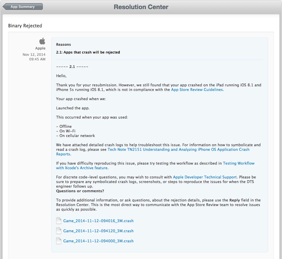 I submitted 4 times to Apple Store the update of my app and it got always rejected, due to a crash when it launch.