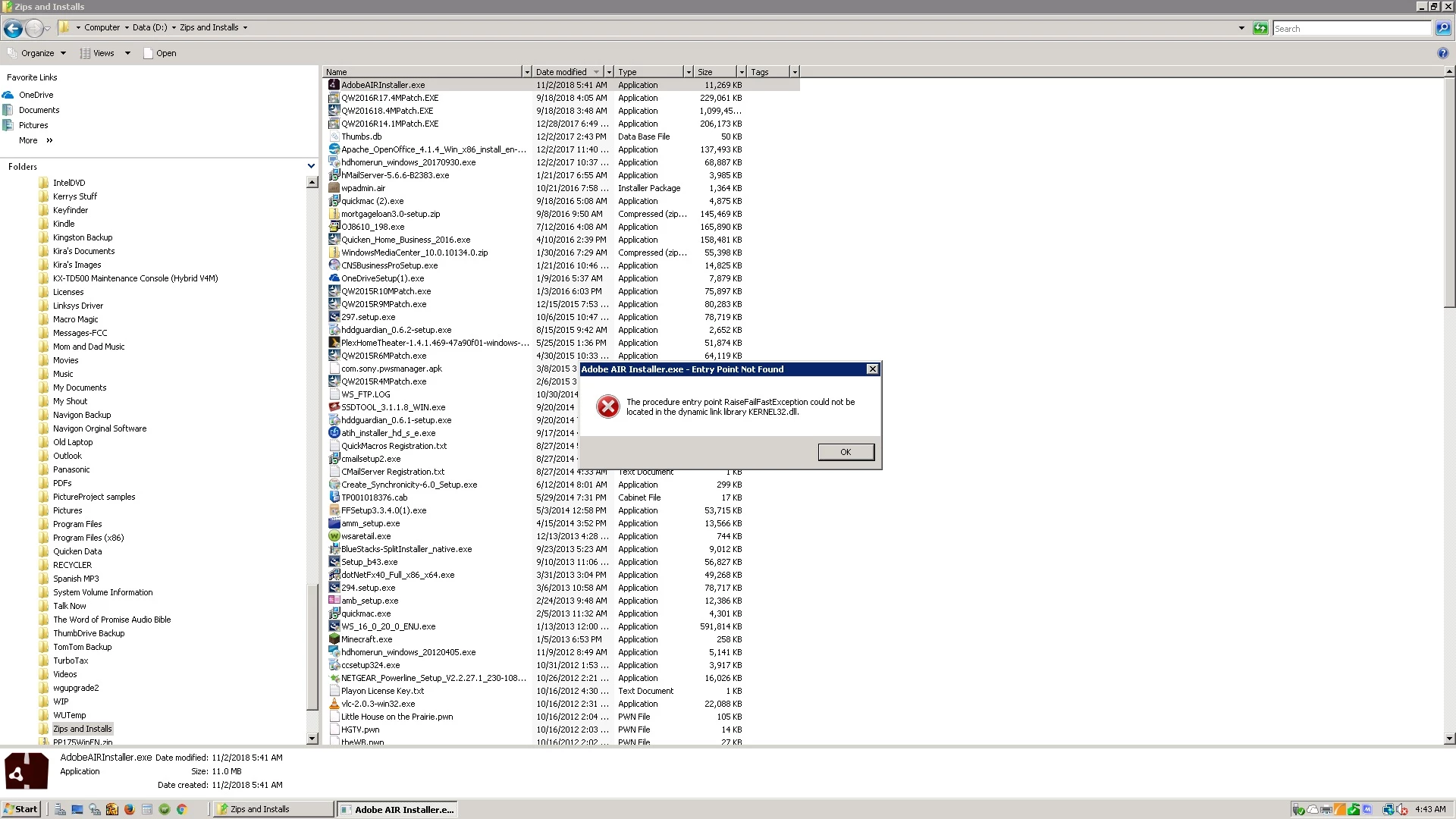 I have been using Adobe Air for over a year on my Server 2008 terminal server environment. A few months ago I could not install the latest Air update which my application needs. When I try to install it I get: The procedure entry point RaiseFailFastException could not be located in the dynamic link library KERNEL32.dll. When I click to acknowledge that I get: This application requires a version of Adobe AIR which cannot be found. Please download the latest version of the runtime from http://www.adobe.com/go/getair, or contact the application author for an updated version.