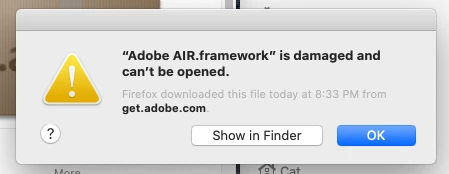 I have downloaded and installed Adobe Air about 4 times now. Each time I delete the previous version (I think), and reinstall. And each time I get the Message attached below saying " 'Adobe AIR.framework' is damaged and can't be opened." I can only assume that the file I am downloading is corrupted, or that the version doesn't work with Catalina, or something. I've tried the help chat, but the wait time is way too long, and I couldn't get any help there. Does anyone have a suggestion as to how I can solve this problem? Your help is greatly appreciated.