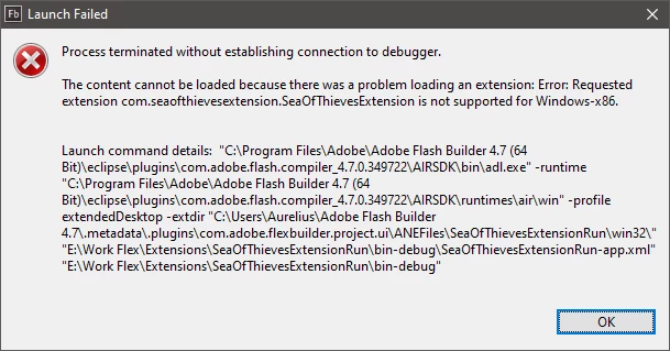 However, when I try to debug the project which uses the 64 bit native extension, I get two error messages: