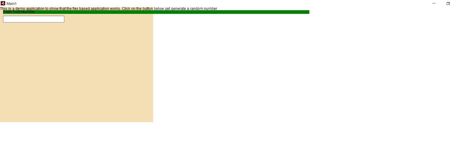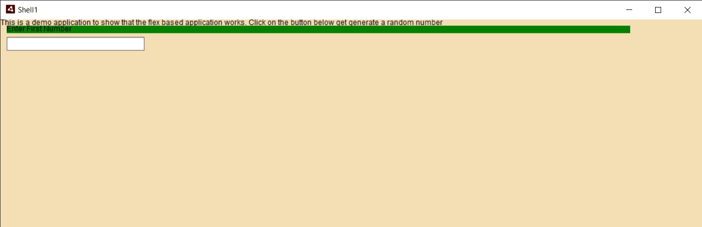 <s:Application xmlns:fx="http://ns.adobe.com/mxml/2009" xmlns:mx="library://ns.adobe.com/flex/mx" xmlns:s="library://ns.adobe.com/flex/spark" width="100%" height="100%" creationComplete="Created(event)" backgroundColor="0xf5deb3"> <fx:Script> <![CDATA[ import mx.controls.Alert; private function Created(event:Event)void { } ]]> </fx:Script> <fx:Declarations> <mx:RemoteObject id="RO" destination="AdministrationHandler" fault="Alert.show(event.fault.faultString), 'Error'"> </mx:RemoteObject> </fx:Declarations> <s:Group id="Group" width="100%" height="100%"> <s:Label id="Introduction" text="This is a demo application to show that the flex based application works. Click on the button below get generate a random number" styleName="FilterLabel"/> <s:VGroup id="VertGroup" paddingLeft="10" paddingRight="10" paddingTop="10" width="100%" height="100%"> <s:Label backgroundColor="green" width="1000" id="firstNumberLabel" text="Enter First Number" styleName="FilterLabel"/> <s:TextInput id="firstNumber" width="20%"/> </s:VGroup> </s:Group> </s:Application>