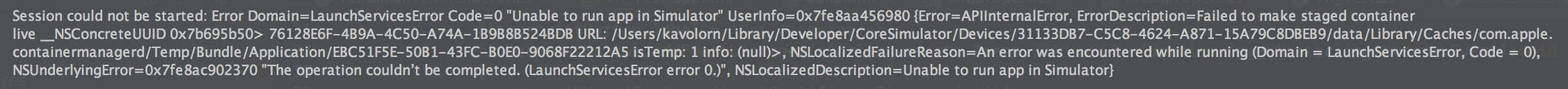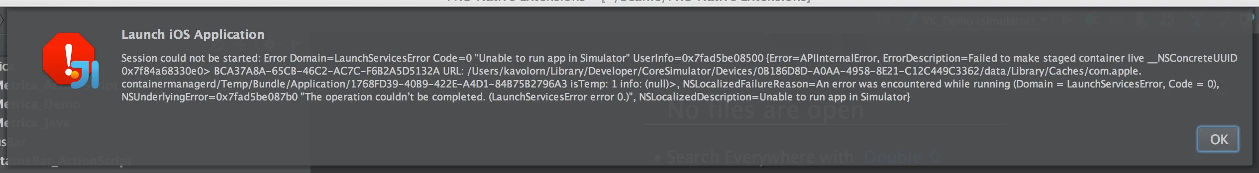 Im using fb 4.7 air sdk 15.0.0.349 with Macosx 10.9.4, xcode 6.1 (ios simulator 8.1) and i keep getting the following response when debugging with ios simulator: