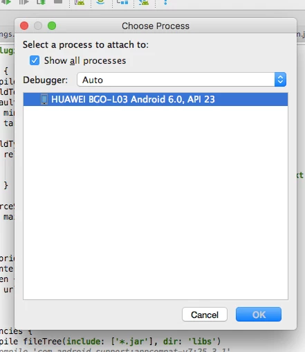Does anyone know how to debug an ANE lib module on Android Studio? With Xcode, one can attache the debugger to an running the app, but with Android Studio when I click the "Attach Debugger to Android Process" menu button, only device name is listed, even I check the "show all processes" checkbox, nothing changed.