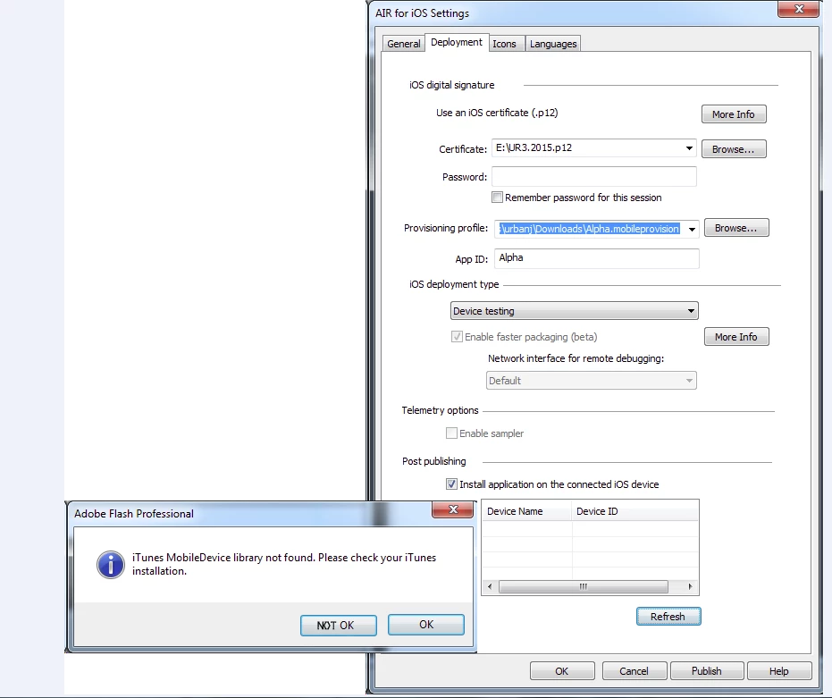 Flash Pro team is investigating the issue "iTunes MoibleDevice library not found..."