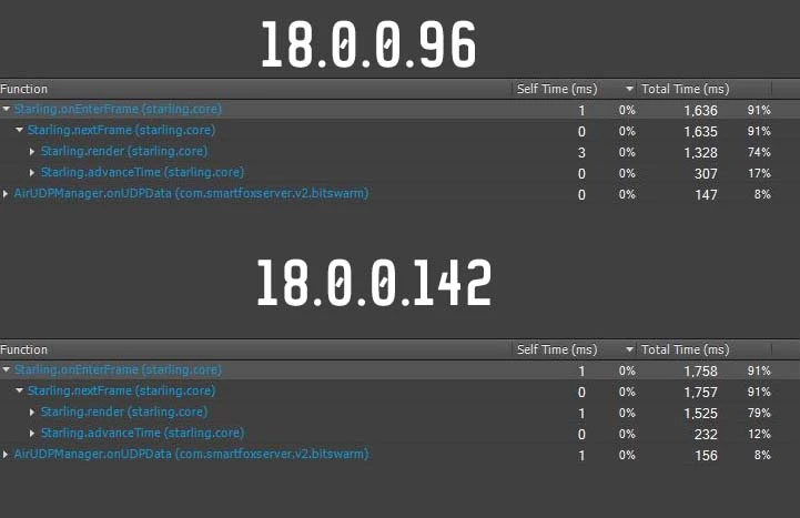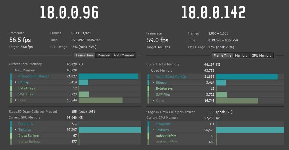 Also, across all tests, Starling.advanceTime CPU load has been reduced more than Starling.render. That's probably all the game logic benefiting from the new SDK.