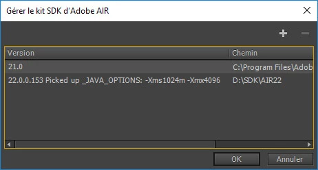 But when I add AIR SDK 22, I have this in my SDK window (so it's OK) but I can't target AIR 22 from Flash, it's not visible.