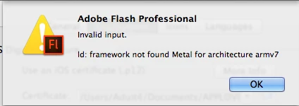 My setups is   Flash CC 2014 Trial version , Actionsript 3.0 , App loader from Xcode 6.0.1 and  Mac OS 10.9.5  and Adobe Air  15
