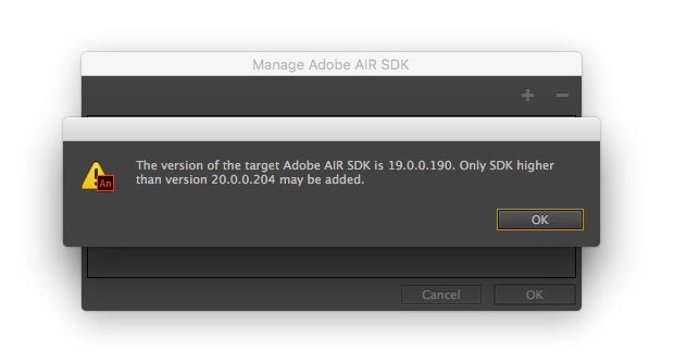 I've tried using a previous version of Adobe Air SDK but Animate CC won't let me add previous versions.