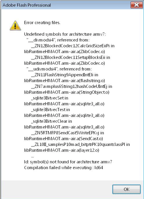 All of a sudden, using the AIR 17 SDK and Flash CS5.5, I can't seem to publish an ipa for my older iPad which is running, deliberately, iOS 4.3.5. If I up the <key>MinimumOSVersion</key> to <string>6.0</string> then there's no problem on iPads running 6 through 8.3. Not sure about 5.0. First it worked, then it didn't. The error that I get on attempting to publish is one I've never seen before. Here it is: