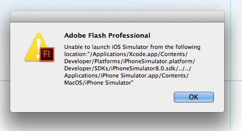 Hi, after upgrading to Xcode 6.0.1, I can not test apps from Flash CC, via "Control"> "Test Movie". I get the "unable to launch iOS Simulator from the following location..." message.
