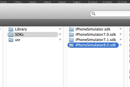 The path I'm using (SDK for iOS Simulator) is: /Applications/Xcode.app/Contents/Developer/Platforms/iPhoneSimulator.platform/Developer/S DKs/iPhoneSimulator8.0.sdk