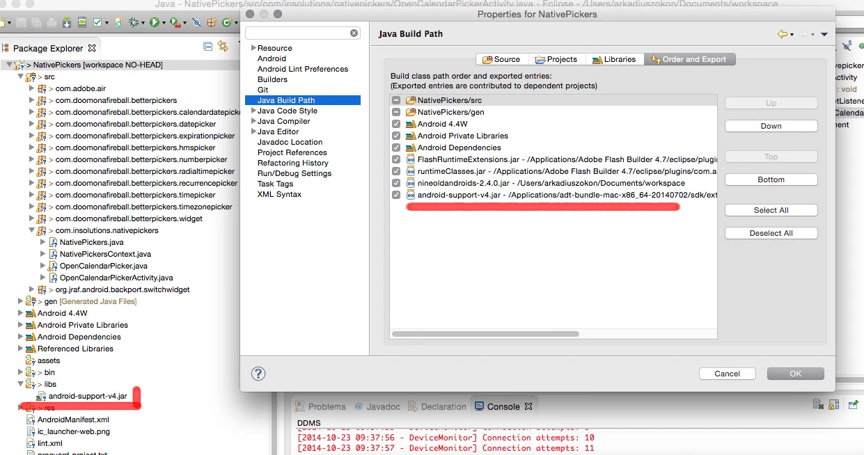 A write native extension for android to display "Better pickers" https://github.com/derekbrameyer/android-betterpickers. To display components from this library I wrote Activity extends FragmentActivity to get FragmentManager. I named my class OpenCalendarPickerActivity. Now I have a problem (from logcat): "Unable to resolve superclass of Lcom/insolutions/nativepickers/OpenCalendarPickerActivity" and "Link of class 'Lcom/insolutions/nativepickers/OpenCalendarPickerActivity;' failed". I include classes from android-support-v4.jar into my project - no result, I try use platform.xml with packagedDependencies tag to include this jar into ane - no result. I can't make this work. PLEASE HELP.