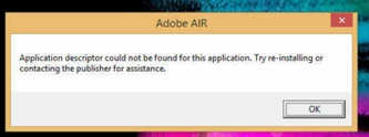 pop up window: application descriptor could not be found for this application. try re-installing or contacting the publisher.