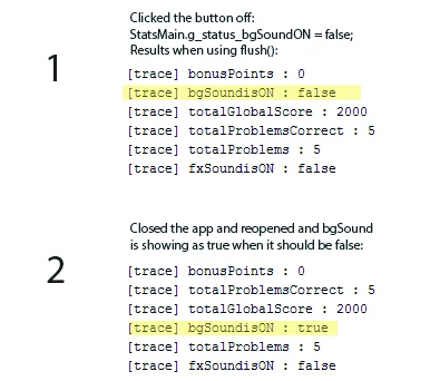 I have a button that is being used to turn the sound on and off. There is a StatsMain class that is used to establish the shared object and the variables. I also have a Settings class that displays the button on/off. The problem I'm having is that the shared object is not remembering the status of the on/off buttons. I'm stumped because I'm using the same process for my game stats (total points, level number, etc.), which works, the only difference is that my game stats are integers and not Booleans.