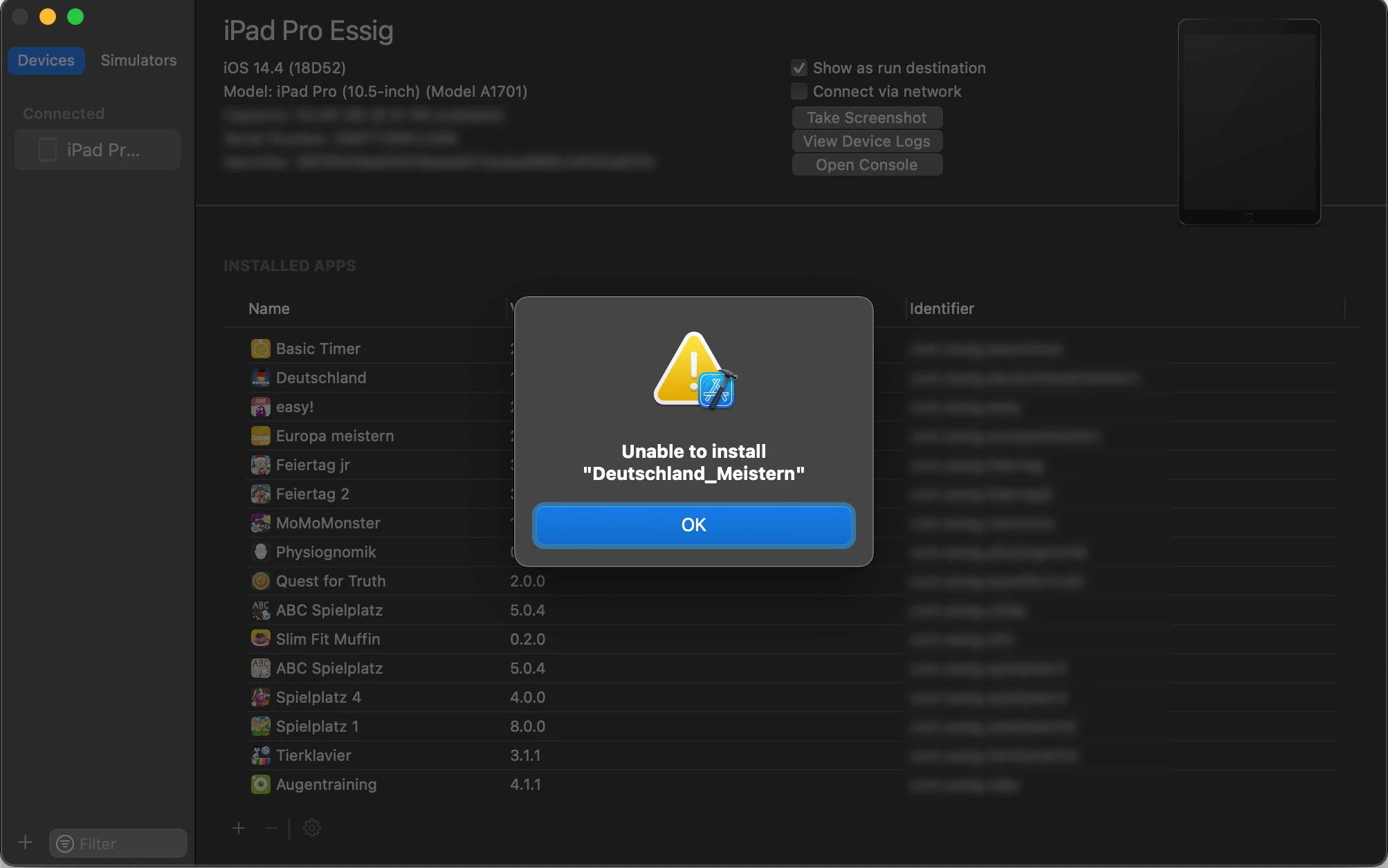 I just wanted to do a quick update on one of my iOS Apps (Published on a Mac macOS 11.2.1 / Adobe Animate 2021 / AIR 33.1.1.406) - I had to create a new developmenet certificate as my old one expired - but somehow XCode tells me each time it is: "Unable to install" my App.