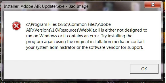 I'm running Windows 7 Ultimate 64-bit. Adobe Air file version 19.0.0.241. Whenever I try to run an application, I get the error message