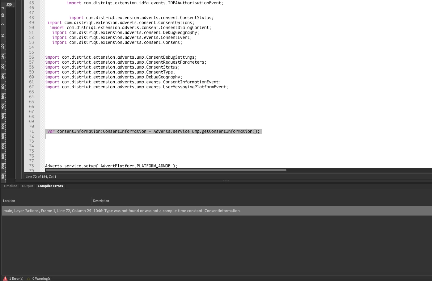 main, Layer 'Actions', Frame 1, Line 70, Column 24 1046: Type was not found or was not a compile-time constant: ConsentInformation.