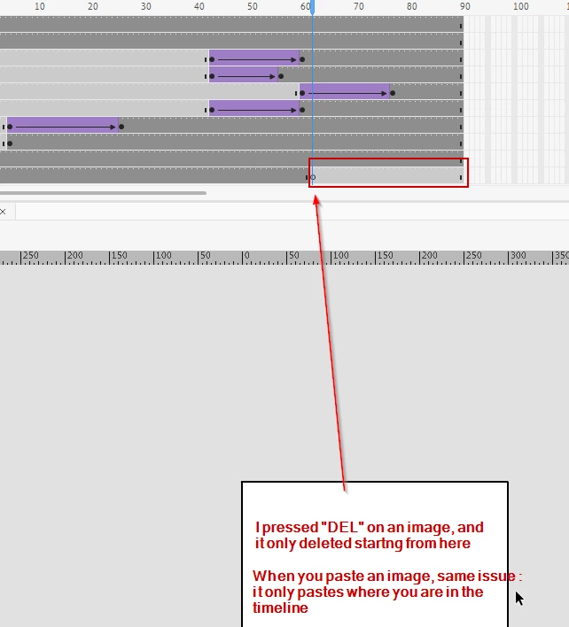 In the latest version of Animate (I didn' use if for a year) when you're on the scene and select something, then hit the delete key, it deletes only from where your pointer is on the timeline. Very annoying.