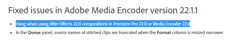 This issue started yesterday when I try exporting video/media from Adobe Animate version 22.0.1 to Adobe Media Encoder version 22.0 after it loads from Animate to Media Encoder the video doesn't show up in the queuce infact Media Encoder freezes and and message Not Responding. I have call customer support three times to no avail and I even uninstalled Adobe Media Encoder and reinstalled it but still Not Responding. Please, Is there a solution to this issue?