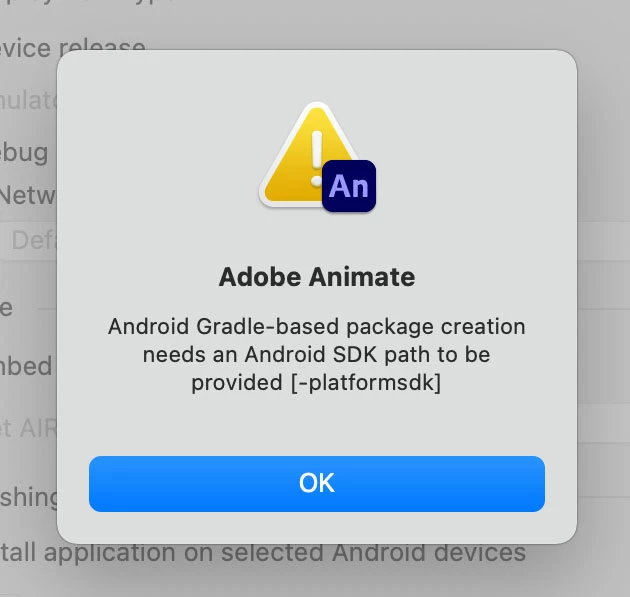 Adobe animate not working properly with Mac Os Monterey + latest AIR SDK