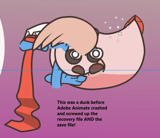 I'm making characters with the various graphics on layers and parented to each other. (The thigh is connected to the body, for example.) TWICE Animate has crashed, and when I've reloaded, every graphic is strangely positioned and rotated throughout the scene, every keyframe! This is true for the recovery file AND my save file. What is going on?! The first time I scrapped the project and started over, but I'm desperately hoping there's an easy fix for this even though I'm pretty sure that the short answer is to just not support Animate and get some other software.