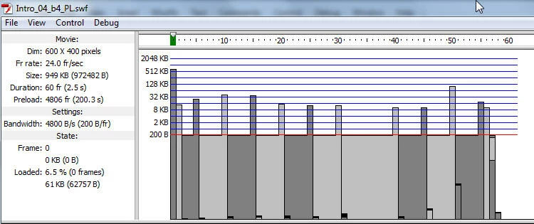The profiler still reads about 300kb in the first frame and it takes until about 50% (about 20 seconds at 56kb dl) until the simple image I put on frame 1 appears.
