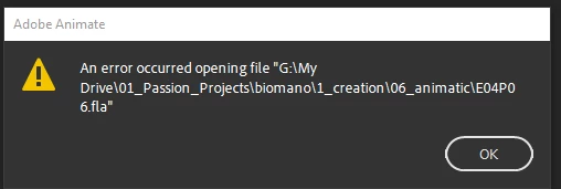 Adobe Animate is alread incredibly unstable as is, but this is too much, because if it doesn't get solved then I cannot open any project I have ever done (except for this last one).