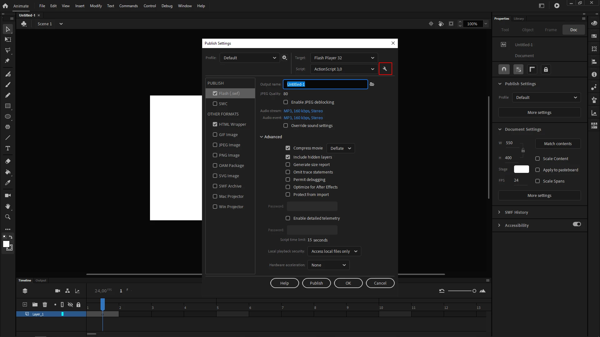 3 - In the Publish Settings (Ctrl/Cmd + Shift + F12), click on the little wrench icon to the right of the Script dropdown menu that displays ActionScript 3,0 by default;