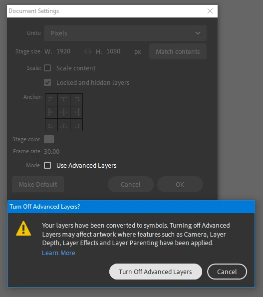 C:\Program Files\Adobe\Adobe Animate 2021\Common\Configuration\Camera\Flash\privatePkg\___LayerProp___.as, Line 1, Column 1 5000: The class 'privatePkg.___LayerProp___' must subclass 'flash.display.MovieClip' since it is linked to a library symbol of that type.
