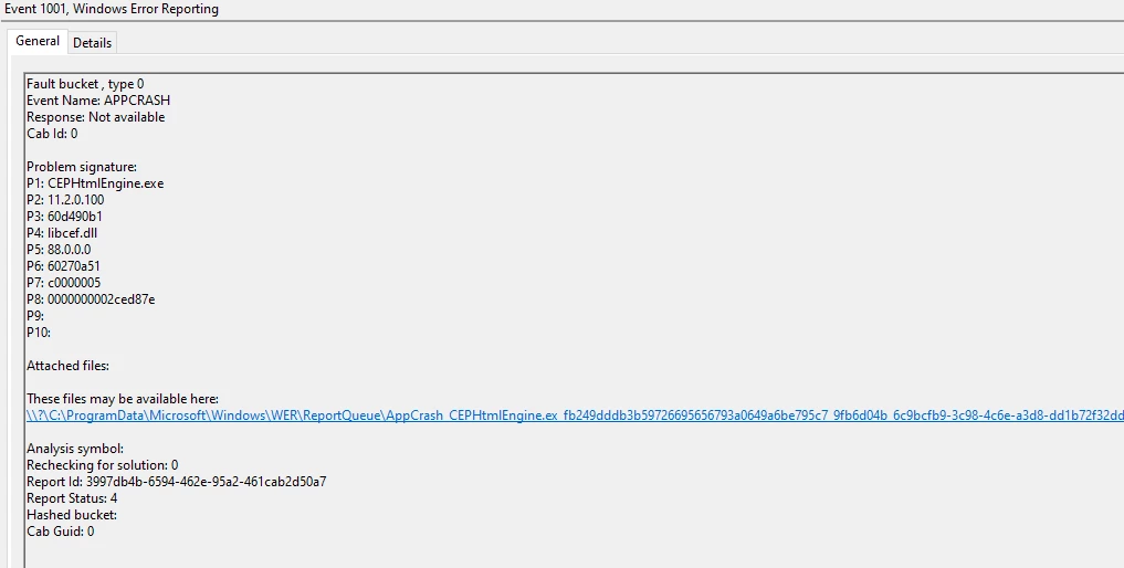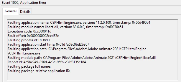 I haven't been using Animate/Flash for a long time, started dabling with it around 3 months ago. At first, everything seemed to be fine, but over time the cracks have started to become more and more visible. It seems anything that has to do with ActionScript Animate will completely nope out on. Actions panel? Crash. Trying to add a code snippet? Crash. The problems extend even beyond that for Animate. Import a video? Crash. Import audio? Crash. Do a seemingly random thing that god forbid isn't drawing on the canvas? Crash. If I don't update from Animate 2019 first, and I install via CC or a direct installer, Animate ceases to function. I can open the program, try to open or make a project, and halfway through loading into the workspace it will crash. No error message. It'll just close, like every other crash here. Only once was I able to get a proper crash in event manager, and it points to CEPHtmlEngine.exe, something thats present in other creative cloud apps and the works. I've also gotten a number of "APPCRASH" errors, also pointing to CEPHtmlEngine with a "problem signature" All of these things I've included in the attached video and screenshots.