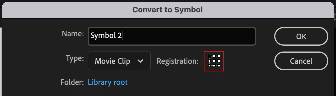 I'm putting together artwork for a 1080p screen (1080x1920px). I've imported an all-over background into the library. When I place it onto the stage and position it at 0,0, it locks to the top left of the stage as I prefer it to, the registration point is top left of the object. However, when I convert to symbol and then drag that symbol onto the stage, its registration point defaults to the centre of the image and I can't for the life of me get it to move to the top left. Inputting 0,0 as the position sees the centre of the image locked at the origin, meaning top left is at -540,-960. This is killing me! Help!
