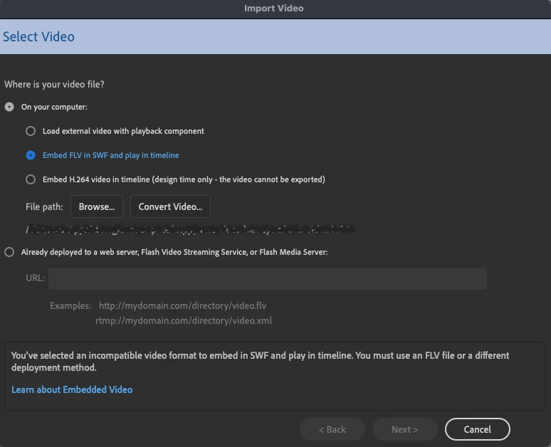 Got a problem here that makes no sense. I want to use the option to have a short video on my timeline in Animate. The option I have is an FLV video, although I cannot seem to convert my video to an FLV since Adobe apparently discontinued support to convert a video to FLV.