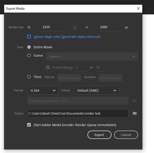 So, my main issue in adobe animate is that whenever i try to export my animation through the media encoder the renderd out animation is all glitchy and wrong. What i mean by glichy is that the played back mp4 file jumps back and forh between diffrent frames (i'll provide examples to show you). What's weird is that when i click the "test movie" button it plays the animation perfecly fine and smooth, so maybe it's my export settings or somthng else. At first i thought it was my laptop not being powerful enough to render properly but i'm exporting this animation on a new hp zbook laptop which i got to spcifcally handle adobe products so i'm not sure it's that.