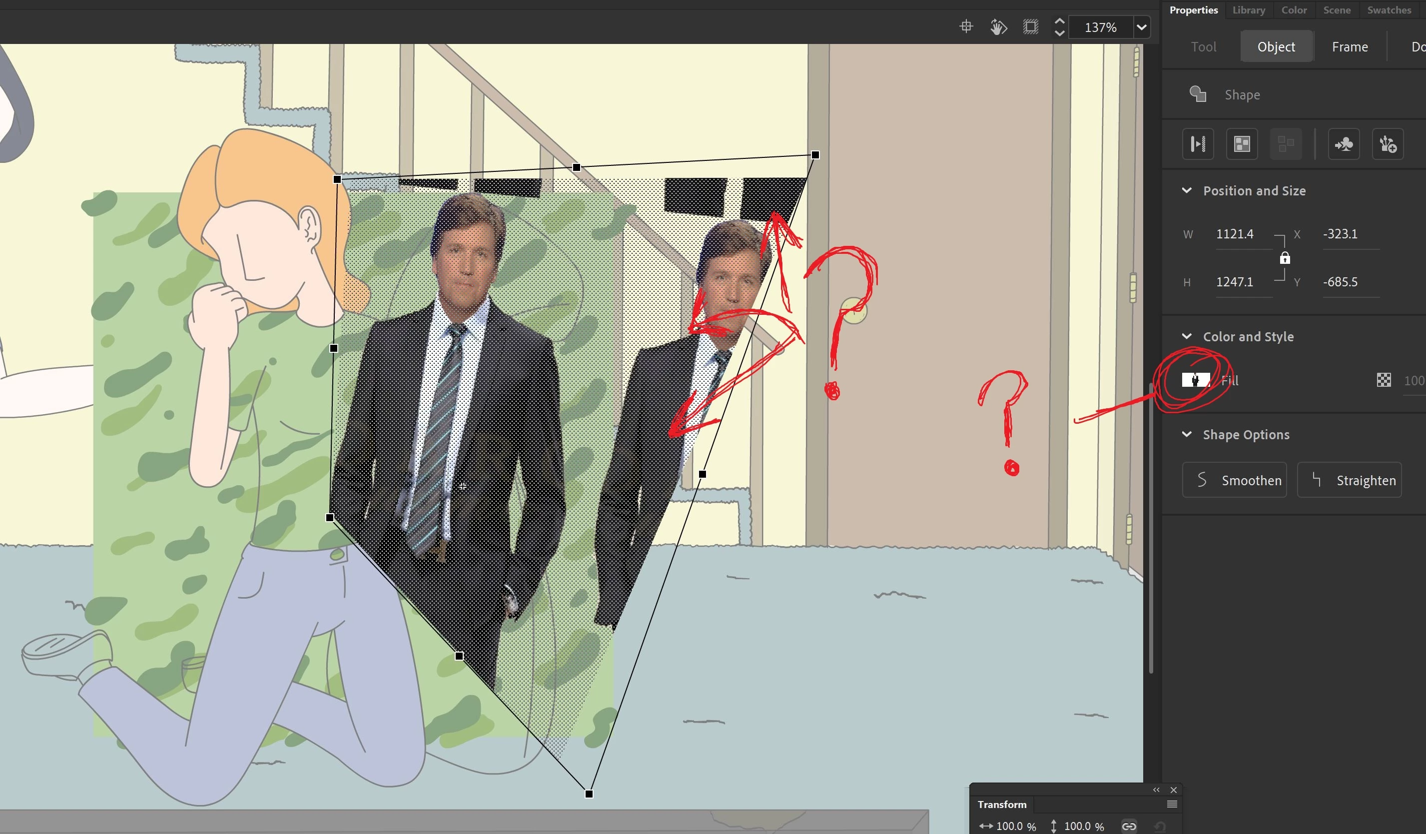 Hi, I'm in the middle of making my next comedy vid and am running into an issue i noticed in a previous video. I'm trying to warp a bitmap image to give it the appearance of being on the surface of an uneven pillow, but when I click distort and try to warp it it only cuts off part of the image or shows me more of it arranged like a checker board. In the last video I gave up and used the asset warp tool, to mixed results. This time i'd like to know exactly why this happens? Also it acts as a fill, instead of the fill being a color when I click on the image.